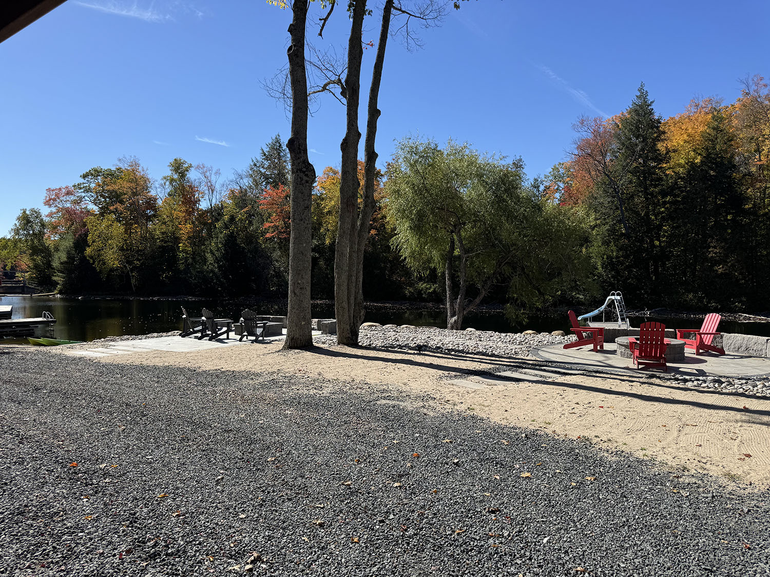 Shared sandy beach and docks. This area also features a beautiful stone fire pit – so bering your own firewood!